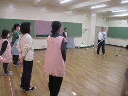 1/14(水)全職員を対象に、嘔吐処理勉強会を行いました。看護師のデモンストレーション後、小麦粉に色を付けた疑似嘔吐物を使用し、飛沫範囲の確認をしながら処理の仕方を勉強しました。