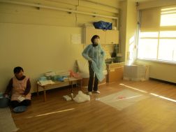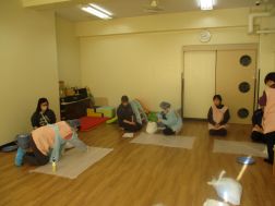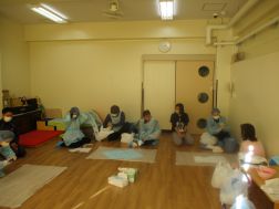 全員が嘔吐処理の方法を実践し、急な嘔吐でも慌てず対応出来るよう、皆で真剣に取り組みました。
