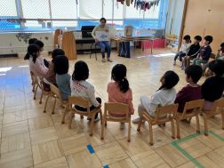 子育て支援講座 在園児との交流未就園児のお子さんと保護者の方を対象に保育園生活の様子を見たり、参加したりするイベントを開催します。当日は2歳児クラスと一緒に朝の会(出欠確認、ペープサートなど)やリトミックに参加していただく予定です。
