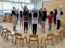 睡眠インストラクター(ヨガインストラクター)のめぐ先生と睡眠について学びました。絵カードを見ながら、睡眠の役割や睡眠時の効果(セレトニンやメラトニンとは)を知り、後半はキッズヨガを行っていただきました。体を動かし、睡眠の大切さを学び、健康な体を作っていきたいと思います。