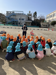 今日は荻窪警察署の方にお越しいただき交通安全教室を行っていただきました。交通事故についての話を聞いた後、5歳児は練習用の信号機を使って道路を渡る練習を行いました。特に信号のない道での歩き方は、子どもたちも少し戸惑っていましたが、一度やってみるとすぐに覚えていました。子どもたちが「車はバックもするよね」という声が。すると警察の方から「バックしている車に近づくことはとても危険です。悲しい事故も多いんです。」というお話がありました。皆真剣な表情で話を聞いていました。1年生になったときに今日の練習を思い出して安全に登下校してくれることを願います。2026/01/23