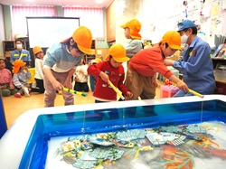 乳児さんは小さなごみ、幼児さんは大きなごみを持って、ゴミパックン号へポーンと入れ、その後にボタンを押してゴミがどのように動いていくかを見せていただきました。