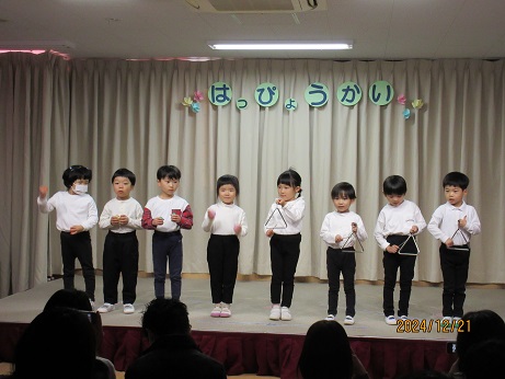 合奏発表は、2グループに分かれて、タンバリン・トライアングルを使って奏でました。曲の雰囲気に合わせて、音を出し、リトミックで教わってきたことを取り入れて披露しました。最後に「手をつなごう♪」の合唱。