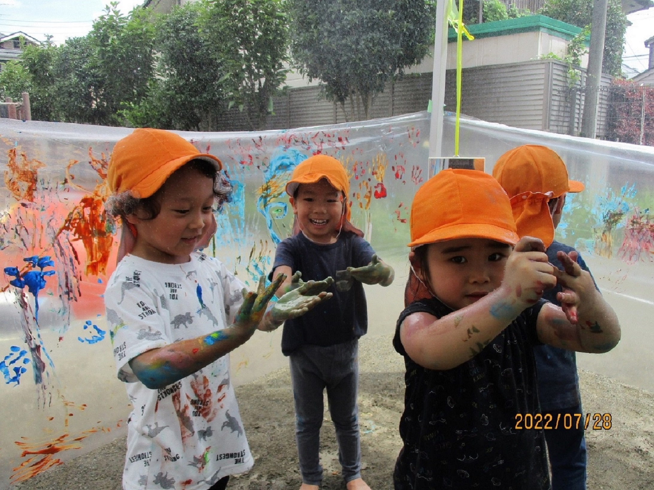 夏の遊びとして、こあらぐみの遊びを紹介します。園庭遊び・水遊びが大好きなこあらぐみの子どもたち。今日は、園庭でボディーペインティングを行いました。前日に伝えていたことから、登園時からとても楽しみにしている様子。園庭の絵の具を見るなり、裸足で飛び出し、絵具へ向かって一直線。鏡も用意し、自分の顔にもお化粧のように絵の具を塗っても、へっちゃらなこあらぐみ。色々な絵の具を混ぜると「地球みたいな色になった」「こっちは、火星」と色合いで、何かに見立てている様子もありました。